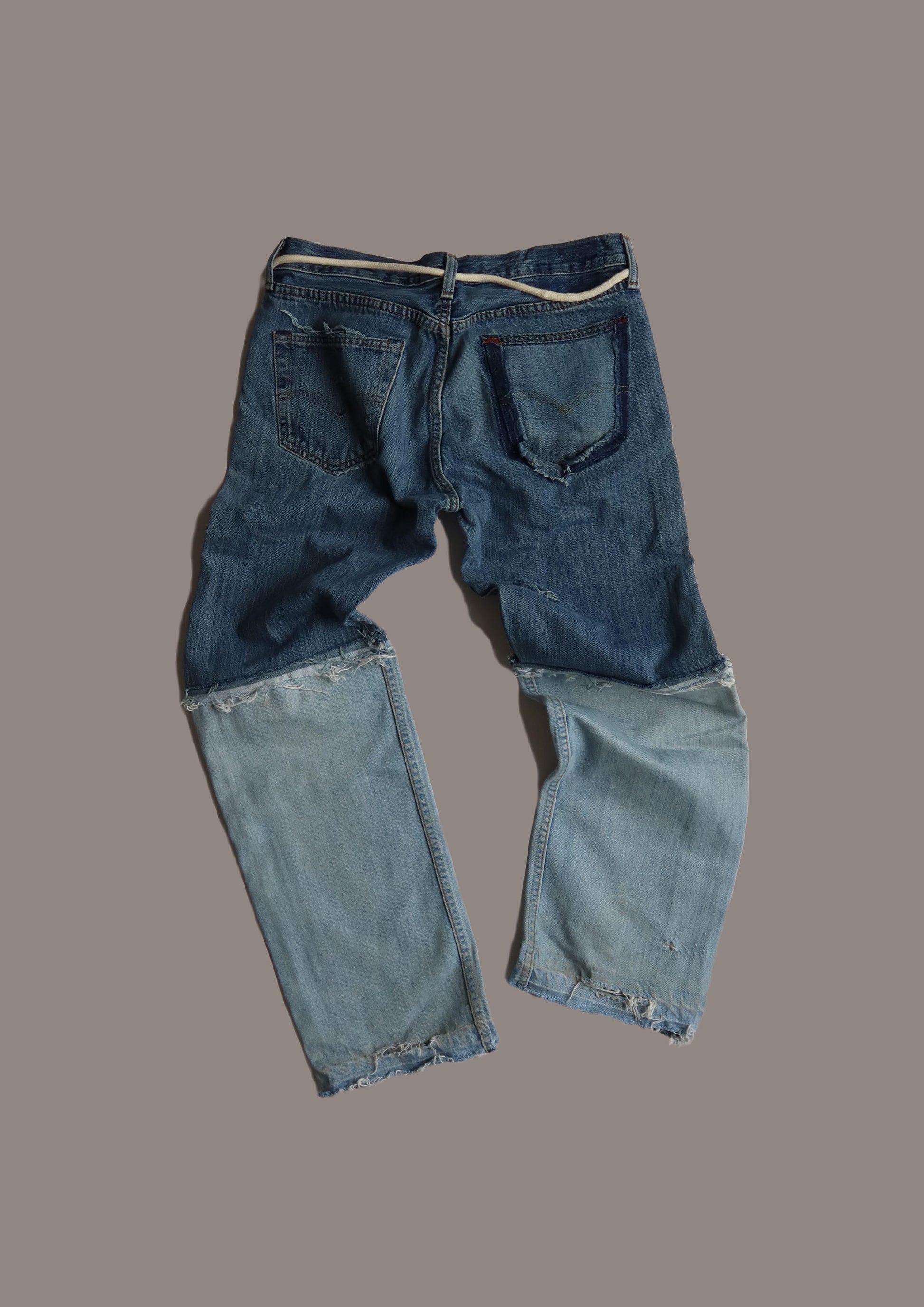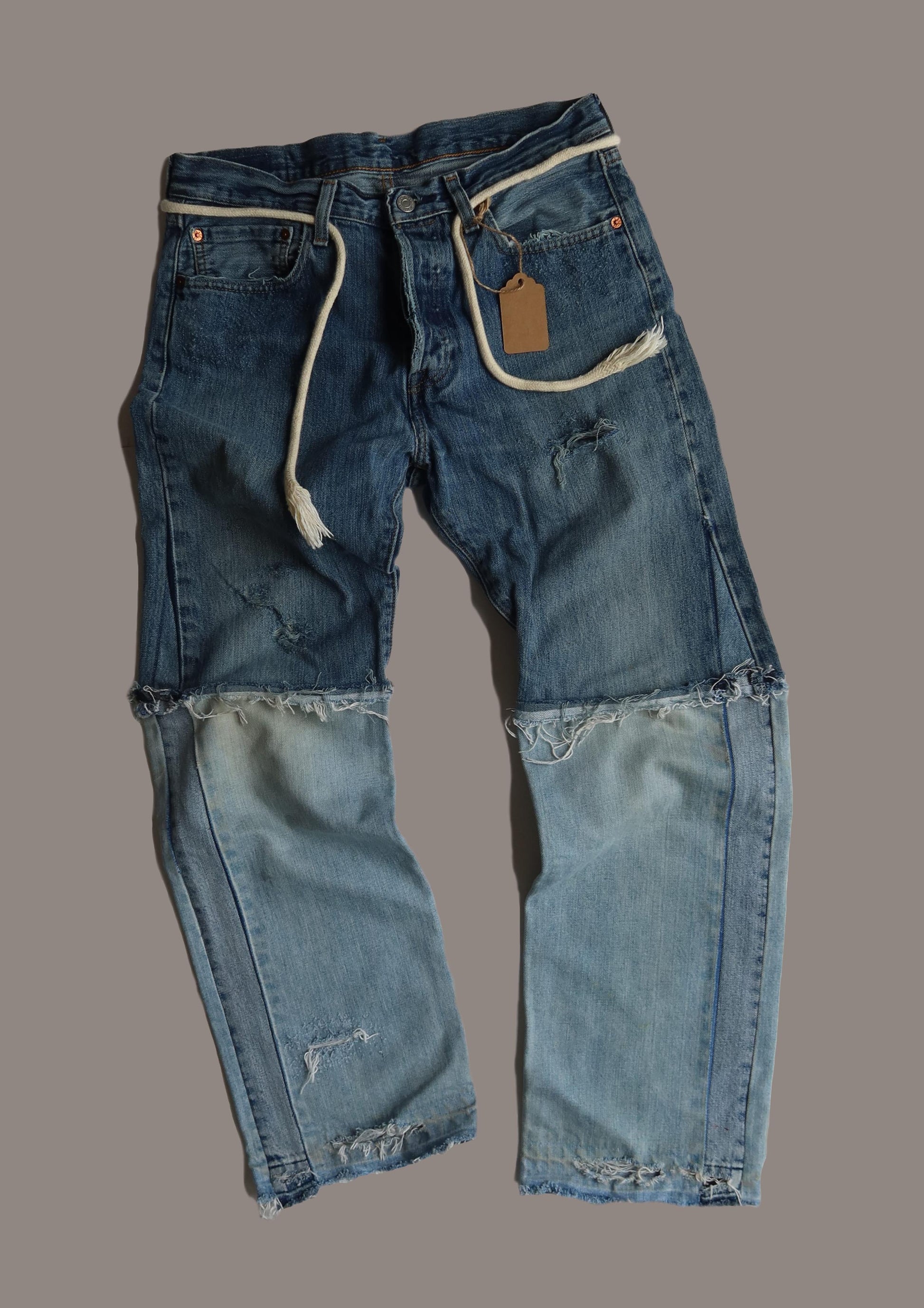Jeans denim bleu foncée et clair coupe large avec corde à la taille.